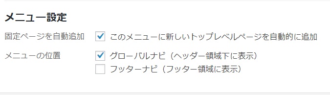 手動ではなく、自動的に固定ページをメニューに追加していきたいという場合は、その下にある「固定ページを自動追加」にチェックを入れます。